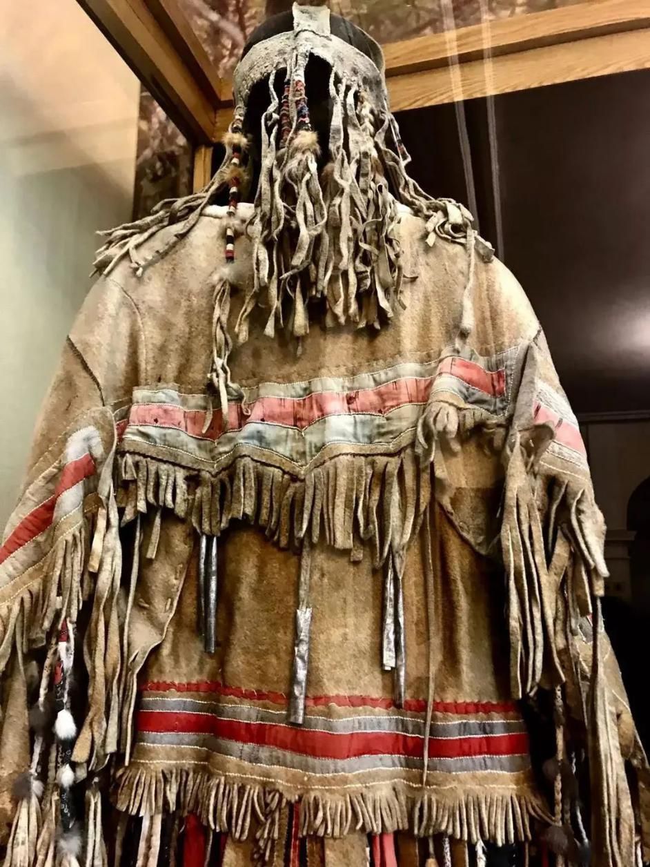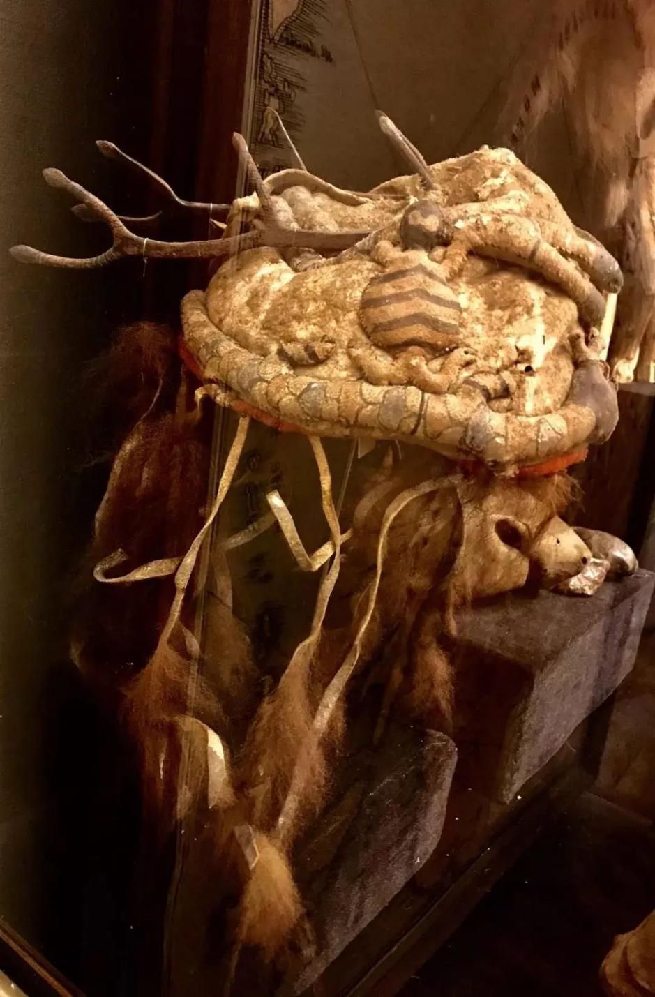 展區(qū)內(nèi)還陳列著幾套保存完整的薩滿(mǎn)服飾,有鹿皮、獸皮、魚(yú)皮和纖維等多種材料。與國(guó)內(nèi)留存的薩滿(mǎn)服飾不同的是其鹿角帽的制作,鹿角帽上裝飾著龜、蛇和神偶形象,頂端八岔鹿角的材料是金屬。