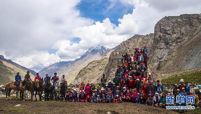 帕米爾高原慕士塔格峰腳下的新疆克孜勒陶鄉(xiāng)喀拉塔什其木干村的村民在夏牧場(chǎng)合影