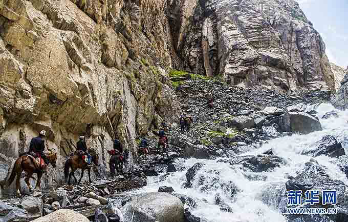 喀拉塔什其木干村村民馱隊(duì)沿著崎嶇的山路前往夏牧場(chǎng)