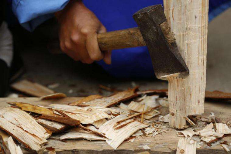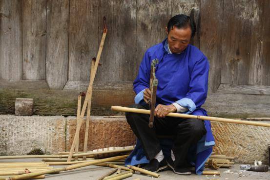 制作蘆笙大的工序有12道,再細(xì)一點(diǎn)有幾十項(xiàng)。如第一道是到山上去選竹子,拿尺子慢慢比劃,三拳的有多長(zhǎng),要很細(xì)心地選,確實(shí)可以用。取下來(lái)之后,第二道工序是拿到河邊去洗,用紗布搓。因?yàn)橹窆苡泻芏喟唿c(diǎn),關(guān)節(jié)處有很多毛,要很細(xì)致的把那些東西全搓掉。弄好之后用太陽(yáng)曬,曬干曬白。第三道工序,就是取杉樹(shù)的木頭做笙斗,計(jì)劃好做三拳的是多少公分,四拳是多少公分。十二道工序,后面越學(xué)越復(fù)雜,每一道工序都很講究。