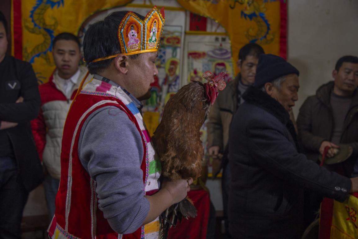 進(jìn)錢之后是解冤,解冤法事一邊解冤錢,一邊先生唱詞,一直到冤錢解完。然后用冤錢連接紅線,法事將完,就把冤錢去掉,放在篩盤中,把冤錢架上的白布、紅線、篾條一并放入篩中把雄雞抱起,打卦,把篩盤由一個(gè)抬起,離開中堂,關(guān)上大門,在三岔路口燒掉茅人。
