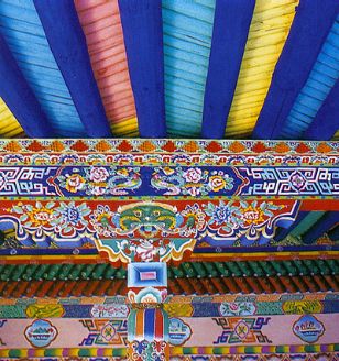 柱頭裝飾包括柱頭、斗拱、大梁等部位的雕刻、彩繪。在藏族居室中柱子、橫梁位置顯要,因此對(duì)這部分的裝飾在整個(gè)室內(nèi)裝飾中至關(guān)重要。無(wú)論高雅精致的殿堂還是普通百姓的民居都充分認(rèn)識(shí)到這一點(diǎn),進(jìn)行合理裝點(diǎn)以求莊嚴(yán)、堂皇、舒適的效果。就拿寺廟集會(huì)大堂的柱頭、橫梁來(lái)講,裝飾十分考究。天花板下的椽子木頂端整整齊齊地、略有間隔地排列在大梁上方,用彩繪的辦法進(jìn)行裝點(diǎn)。椽子至大梁之間夾著兩道橫杠,其上道用累卷疊函凹凸方格木雕處理,下道橫杠用蓮花瓣依次排列的雕刻或彩繪完成,這種裝飾是約定俗成的,上下圖案不能隨意調(diào)換。橫梁上的裝飾大多采用填充連接長(zhǎng)方格來(lái)進(jìn)行。橫梁表面劃分大小等同的長(zhǎng)方格,這些連接的長(zhǎng)方格內(nèi)或填寫(xiě)梵文經(jīng)文,或繪各種花卉,用這樣的手段裝飾大梁。柱頭與橫梁之間是斗拱,藏族建筑對(duì)斗拱的裝飾非常講究。斗拱分兩層,上為長(zhǎng)弓,下為短弓。斗拱長(zhǎng)短兩弓本身形狀要精心雕摟,其表面也用雕刻著色的辦法加以渲染,以求良好的裝飾效果。斗拱裝飾有簡(jiǎn)有繁,最簡(jiǎn)單的斗拱形狀為梯形,這種不加任何雕飾的斗拱多見(jiàn)于底層的儲(chǔ)存室內(nèi)。而寺廟建筑大堂、佛堂之類重要殿堂內(nèi)的斗拱是經(jīng)過(guò)精心雕鏤的藝術(shù)品,尤其是斗拱長(zhǎng)弓形狀千姿百態(tài),通常見(jiàn)得較多的有祥云狀,此外還有各種花瓣?duì)?,其裝飾效果相當(dāng)強(qiáng)。除了斗拱形狀的雕刻外,表面上雕刻各種圖案獲得錦上添花的效果。長(zhǎng)弓中心雕刻佛像,兩邊及邊緣雕刻祥云、花卉、整個(gè)斗拱表面顯得飽滿、大方。柱子、柱頭也是裝點(diǎn)的一個(gè)良好的空間,柱子形狀有圓有方,也有部分多角柱。柱子最上面的部位或雕或繪花瓣,在下是長(zhǎng)城箭垛式圖案,這兩樣圖案的下面是短簾垂鈴式圖案,所有柱頭裝飾圖案基本上按此模式制作。除了雕鏤精細(xì)的寺廟大殿柱頭大梁裝飾以外,大量的柱頭裝飾見(jiàn)于藏族民居室內(nèi)。民居室內(nèi)柱頭大梁裝飾的基本走向、風(fēng)格與寺廟裝飾設(shè)有大的區(qū)別,彩繪圖案、顏色運(yùn)用、布局結(jié)構(gòu)除了個(gè)別外,與寺廟裝飾相同,只是民居室內(nèi)柱頭大梁裝飾多半是彩繪,幾乎見(jiàn)不到雕刻,這是經(jīng)濟(jì)條件所限呢還是等級(jí)待遇不同不得而知。兩者除了裝飾上的簡(jiǎn)繁區(qū)分之外其余部分很好地保持了藏民族建筑風(fēng)格的一同性。