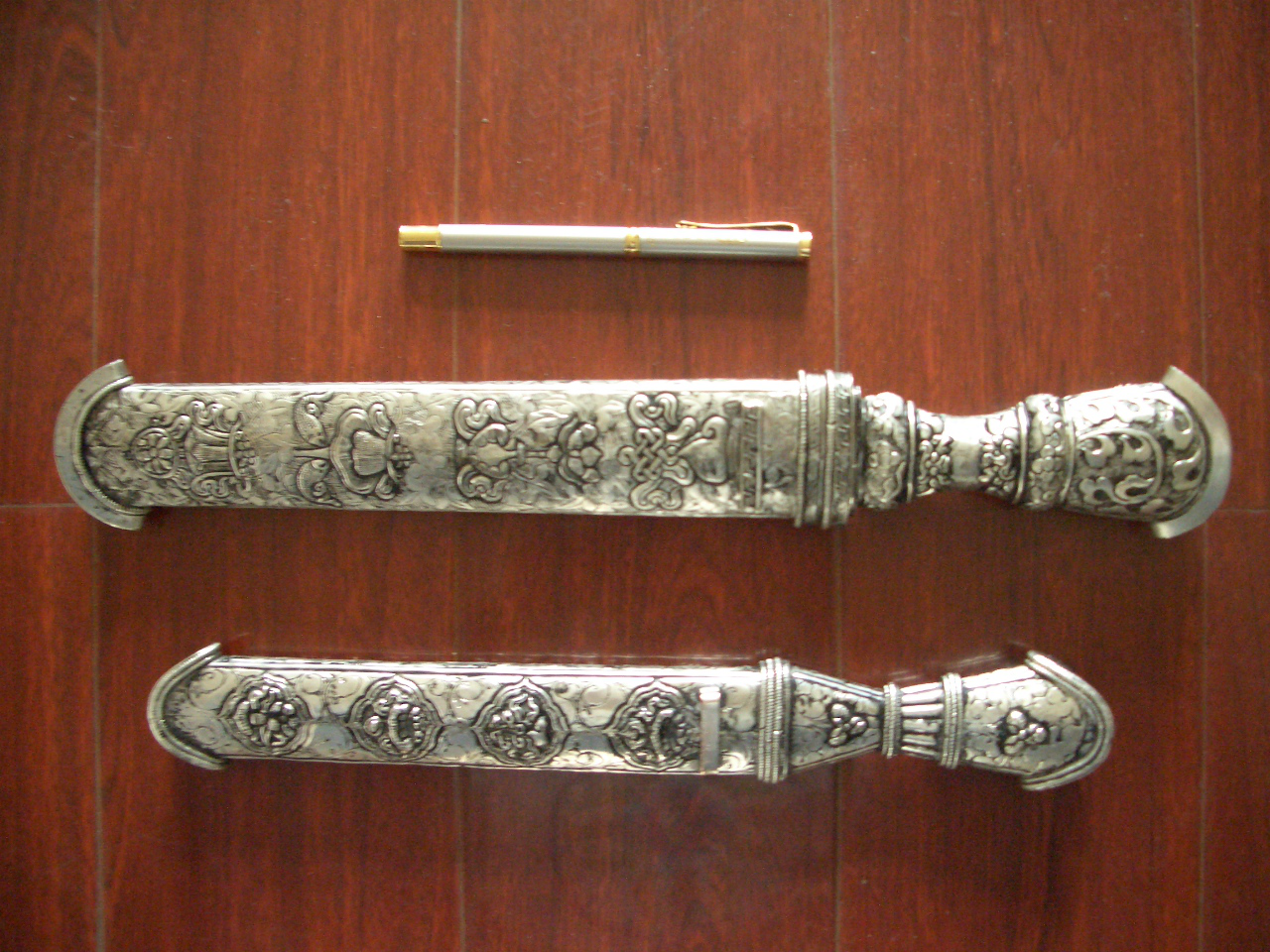 藏刀具有生產(chǎn)、生活、自衛(wèi)、裝飾4種用途,已有1600多年的生產(chǎn)歷史,做工講究,刀身用鋼材鍛,刀柄用牛角或硬質(zhì)木料加工而成。從規(guī)格尺寸上分,藏刀大致為長刀、短刀和小刀三種。長刀最長的有一米多,短刀約40厘米左右,小刀則僅有十幾厘米長。從形狀上講,具有很強(qiáng)的地方特色,有牧區(qū)式、康巴式、后藏式等區(qū)別;用途也有很多種,如林區(qū)砍樹有專門的砍樹刀,屠夫用的屠宰刀等。 藏刀把多用以牛角、牛骨或木材制成,較高檔的刀把用銀絲、銅絲等纏繞,刀鞘則更為講究,較簡單的有木鞘或皮套外,多數(shù)是包黃銅、白銅,甚至包白銀、鍍金等,上面刻有精美的飛禽走獸及花草等各種圖案,有的還鑲嵌各種寶石、彩石,顯得華麗和富有。拉孜生產(chǎn)的藏力,歷史悠久,樣式美觀,淬火適中,刀刃鋒銳,再配上精致、貴重的刀鞘,雕著龍、鳳、虎、獅和錦花圖案,精美的藏刀大都出自能工巧匠之手。由于鍛打精致,鐫刻細(xì)膩,色彩奪目,并附有藏文,系有五顏六色柄穗,形成別具一格的藏族工藝品。藏刀的主要加工材料有銀、銅(白銅、黃銅、紫銅)、鐵、鯊魚、牛角、瑪瑙、硬雜木等。過程有冶煉熔化、模具翻鑄、敲摳大形、刻花鑲嵌、焊接組合、加固、銼磨整形、精雕細(xì)刻及鎂洗拋光等工序。