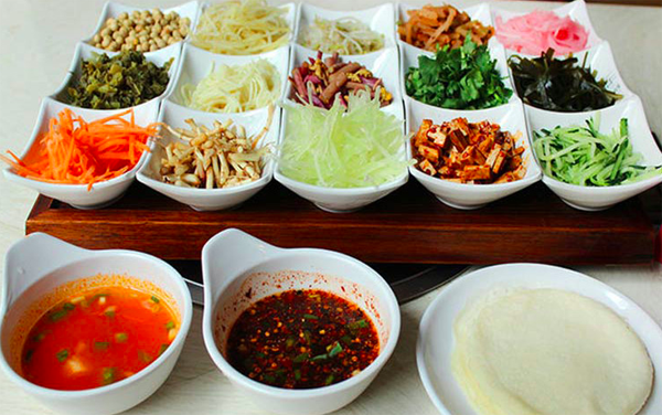 制作方法:烙。面粉加水,鹽少許揉勻搟透(水與面粉比例為1:6),平鍋燒熱刷油、擦干,然后左手抓起面團甩圓并向鍋底杵一下成為直徑為9厘米的圓薄皮時,右手立即把圓形面皮揭起,這樣制作數(shù)十張春卷皮,放入蒸籠稍蒸一下使其回軟,便于包食。再將綠豆芽、海帶絲、芹菜節(jié)、蕨菜節(jié)用開水氽過,分別裝入小盤中,小碗內(nèi)放入醬油、醋、味精、麻油、姜沫、蔥花、辣椒兌成汁。春卷皮中放入各種素菜絲包成上大下小的兜形,放入酥黃豆或油炸花生,澆淋兌好的辣椒汁即成。