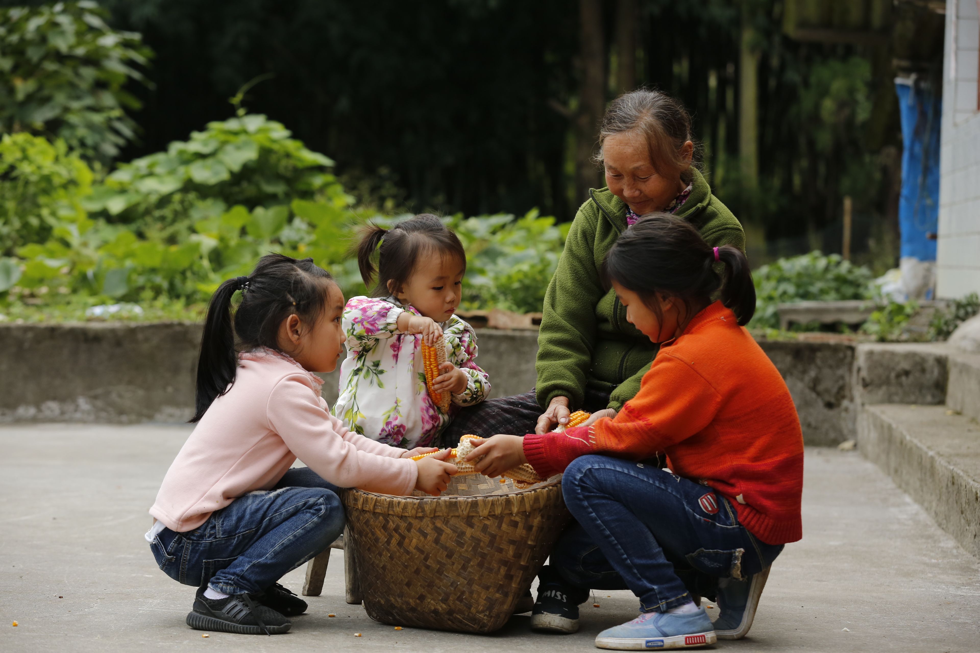 圖片說明:貴州貴陽苗族老年人與兒童剝玉米